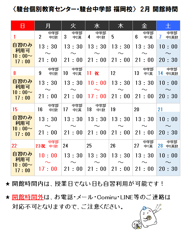 2月 開館カレンダー