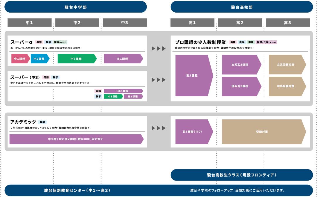 また、授業は、多くの中高一貫校と同様に1年先取りで進みます(一部講座を除く)。各単元を学校と駿台で繰り返し学習できるようにカリキュラムを構成し、授業進度についても学校との両立が可能です。