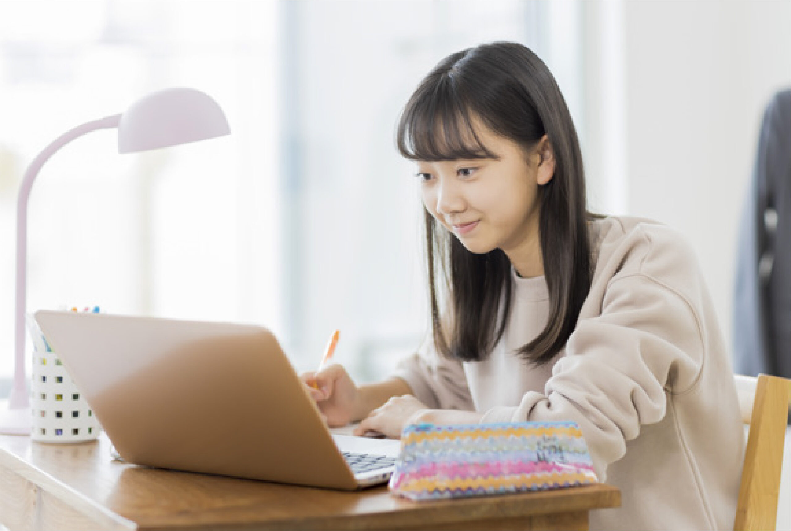 オンライン会議システムを使用した「オンライン授業」を実施しています。インターネット環境があれば、お持ちのタブレット端末・スマートフォン・パソコンを使用し、ご自宅での受講が可能です。校舎で行っている授業をリアルタイムで配信するため、原則、対面授業と同じ講師、同じ教材で受講いただけます。