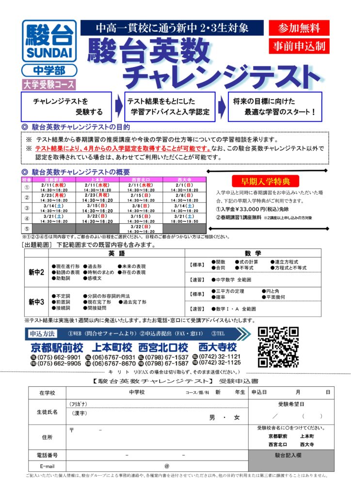 駿台中学部では、春期講習受講や通常授業4月入学をご検討の方、ご自身の客観的な実力の診断をしたい方対象に、無料で現在の学力チェックをいただける、春期チャレンジテストを実施いたします。当テストの結果をもとに、学習相談や冬期講習・通常授業受講のご相談もお承りいたします。ぜひご参加ください。