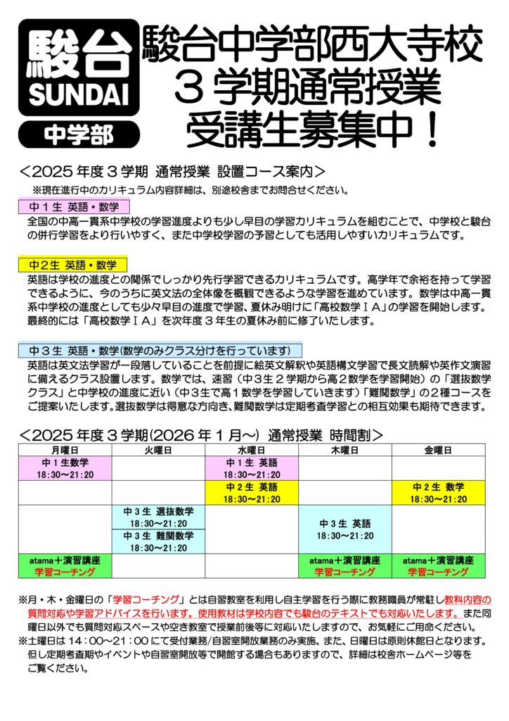 中学部西大寺校では冬期講習は1月9日(金)に終講、三学期通常授業は1月10日(土)より開講(中学部西大寺校は土曜日通常授業がないため12日(月祝)より実質開講)いたします。