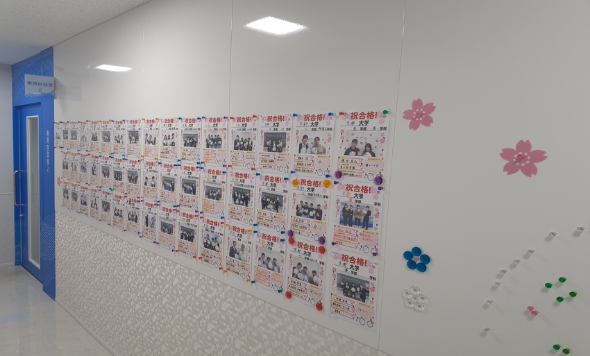 西大寺校でも、受験生の先輩でもある「クラスリーダー(=駿台OBOG中心の大学生教務指導アルバイト)」の激励コメントや各担当講師による激励寄せ書きを展示して、受験生を応援しております。